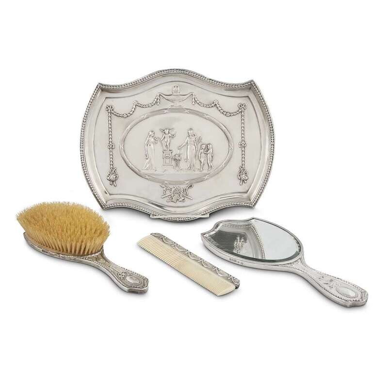 Comprising brush, hand mirror, comb, and tray; all pieces marked. (4).