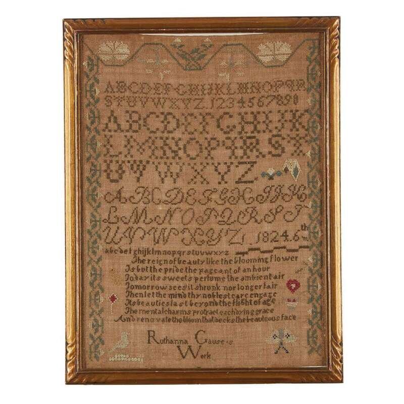 Needlework sampler "Ruthanna Gause's work 1824," Chester, PA