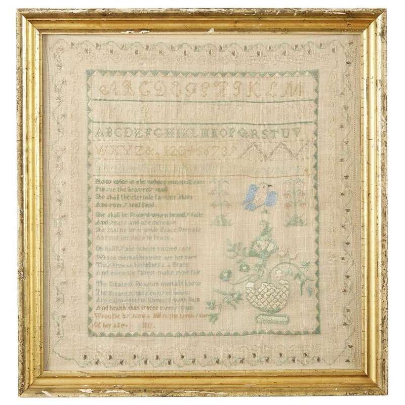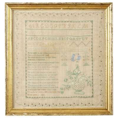 Wrought with multicolored threads on linen ground, meandering vine border surrounding center containing alphabet and virtuous poem, with urn, flowers, and bird flanked by strawberry plants, framed.