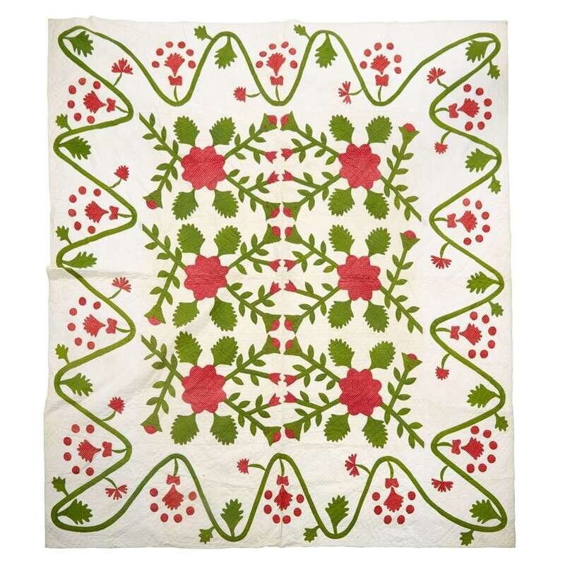 Printed red and green cotton pieces arranged in a bold undulating border enclosing large leaves and flower blossoms, heightened with diagonal line and conforming quilting.