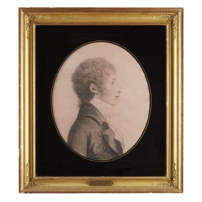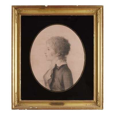 Charcoal and pastel on pink paper, églomisé mat, framed.