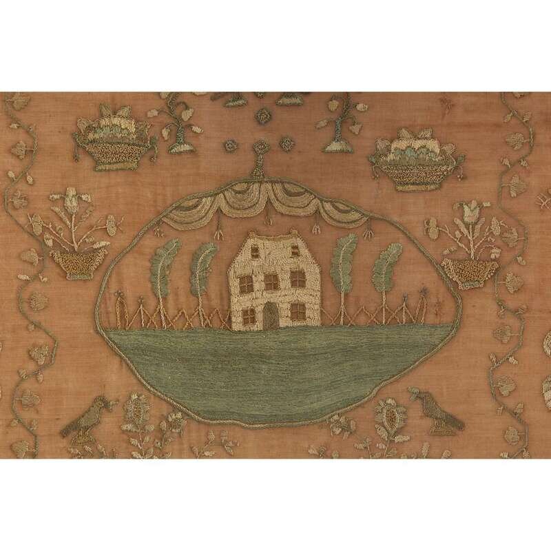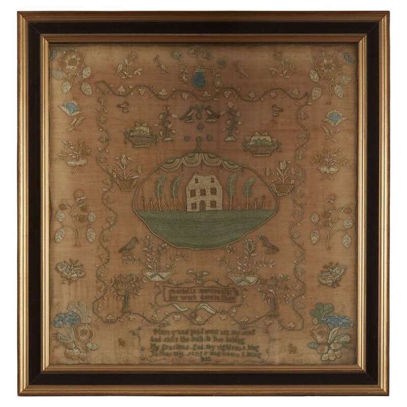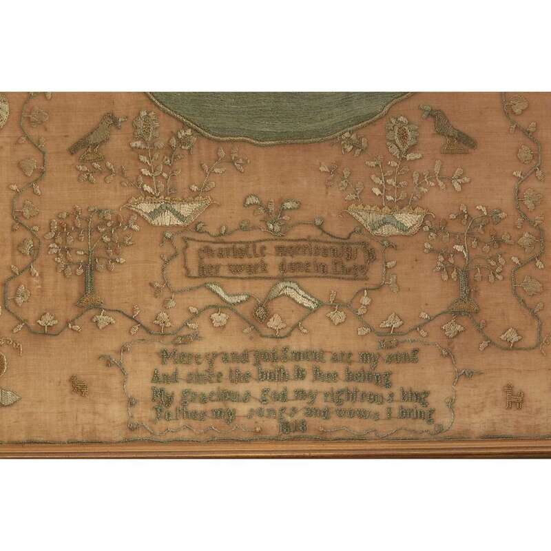 "Charlotte Morrison her work done in the 8th," polychrome silk threads on a gauze ground, framed.