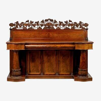 circa 1830 Of grand proportions, the top surface and base with gadrooned edges, two graduated pillars and pilasters with acanthus carved bases flanking three storage doors, all below two drawers, the pierced backsplash with intricately carved grapevine which is possibly unique.