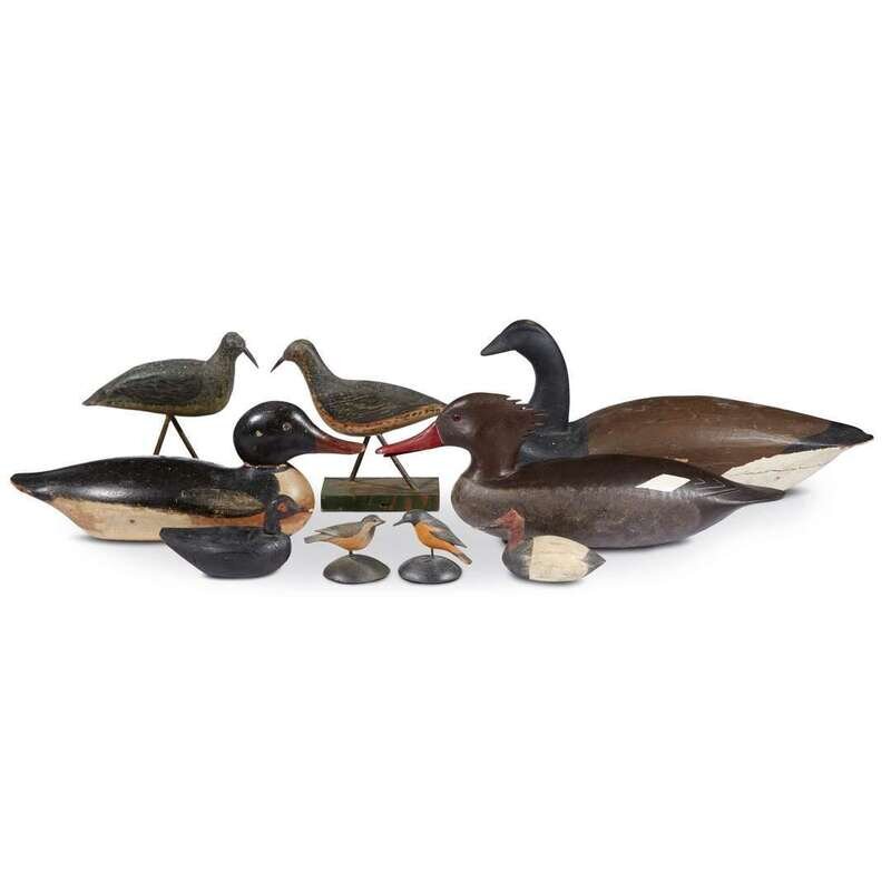 Group of nine carved and painted decoys and miniature birds Various makers, late 19th/20th century