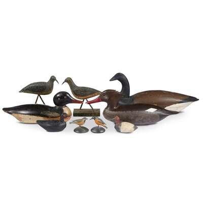 Including two shorebirds; a red-breasted Merganser hen, a Brant, and a Golden Eye hen, all with spurious labels to underside; two miniature decoys; and two decorative carvings signed "C.W. Waterfield/Black-Capped Chickadee" and "C.W. Waterfield/Baltimore Oriole."
