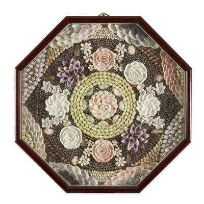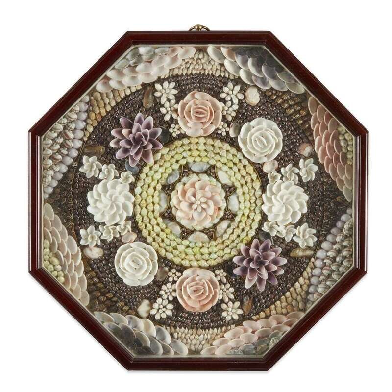 Various shells arranged as flowers within concentric circles, all within an eight-pointed star device; framed.