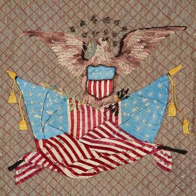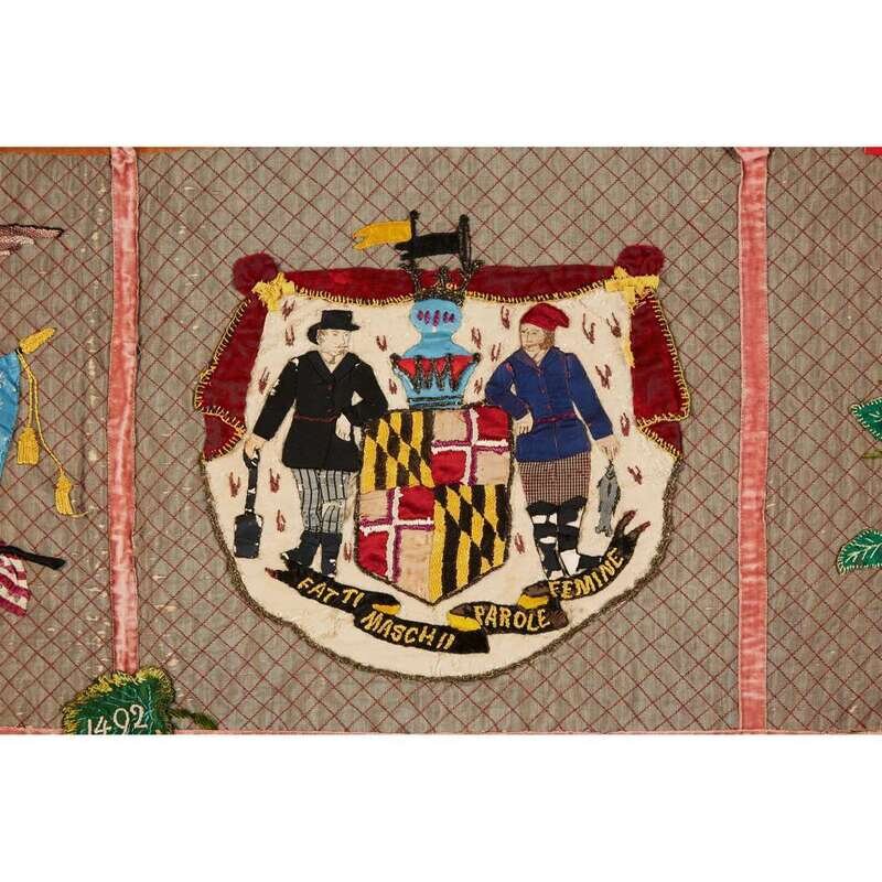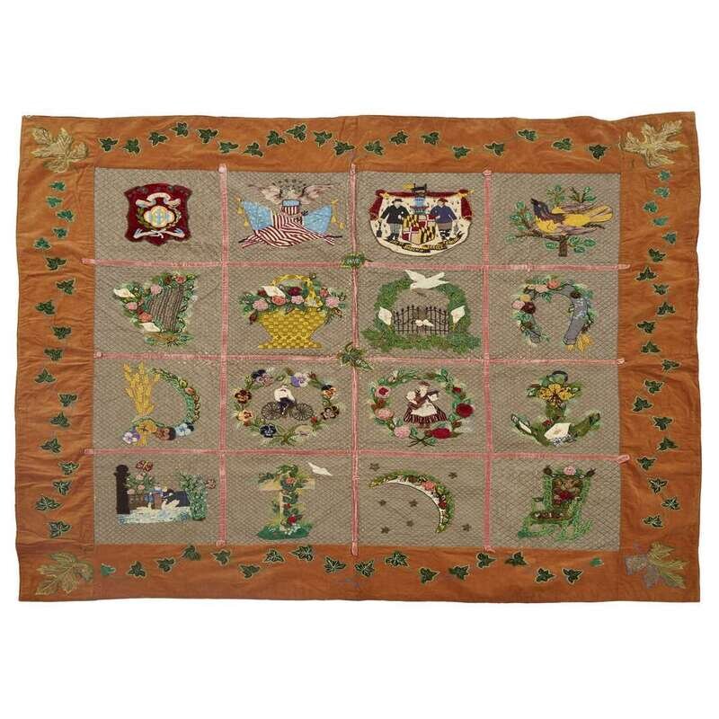 Worked with sixteen squares enclosing various designs, including: the Great Seal of the State of Maryland, crossed American Flags and a eagle, a Baltimore Oriole, Improved Order of Heptasophs emblem, a bicyclist, floral and religious devices and sentimental scenes worked in polychrome fabrics and heightened with silk and novelty thread embroidery, enclosed by ivy vine border.