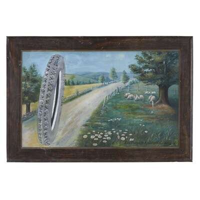 Depicting a tire rolling down a country lane.
