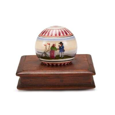 Decorated with a man and woman with ship beyond, the ends decorated with sepia "bull's eye and pinwheel" device.