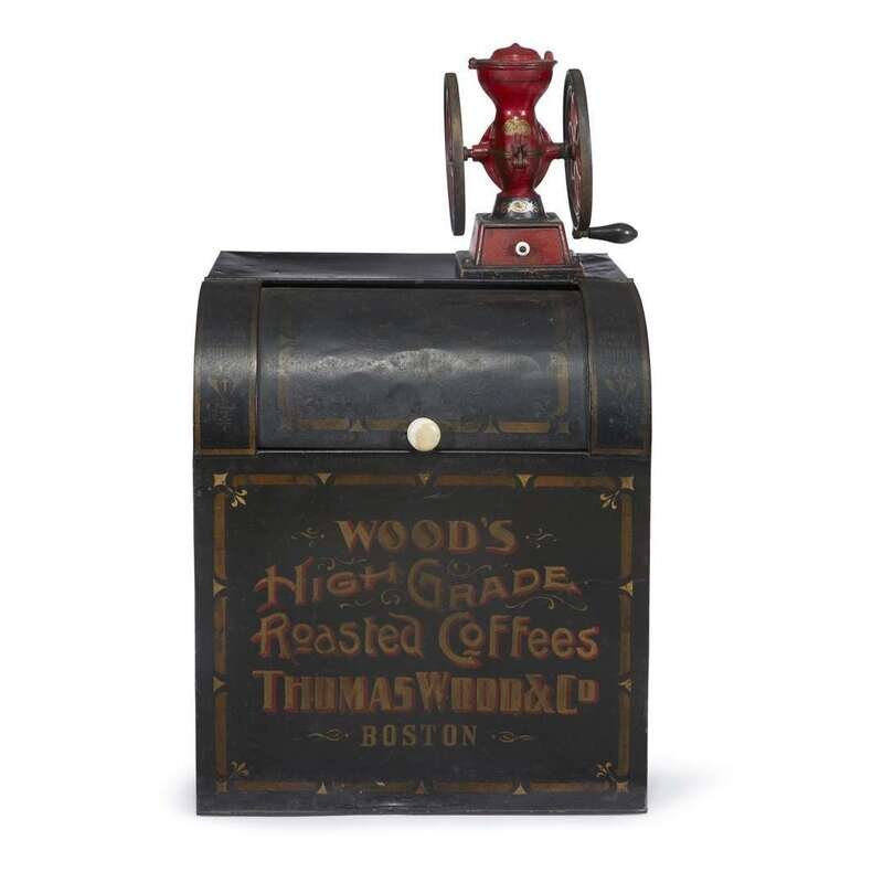 Boston, MA, 19th century The coffee grinder inscribed "Enterprise Mfg. Co., Philadelphia" and the coffee bin with stenciled inscription "Wood's High Grade Roasted Coffees/Thomas Wood & Co./Boston."
