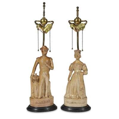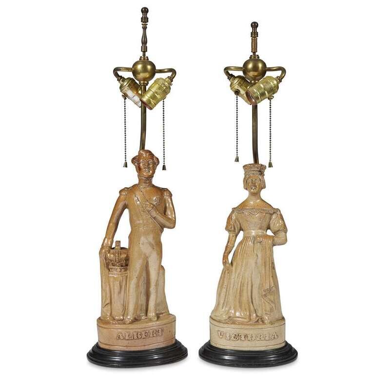 Pair of salt-glazed stoneware novelty bottles in the form of Queen Victoria and Prince Albert Impressed mark of merchant, "Burton Late Burton & Gillbank Pi