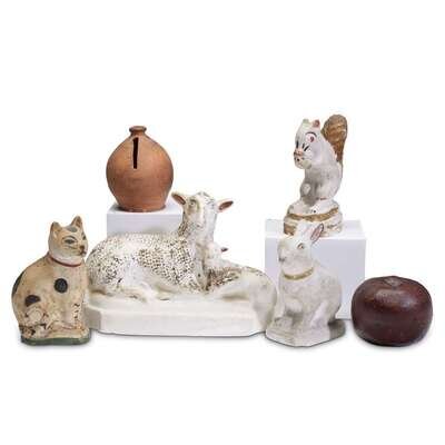 Comprising sheep with lamb, squirrel, cat, rabbit, apple-form bank, and redware bank.