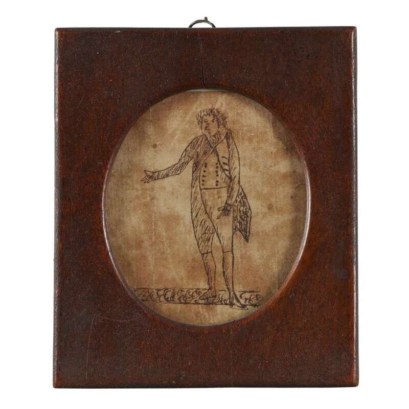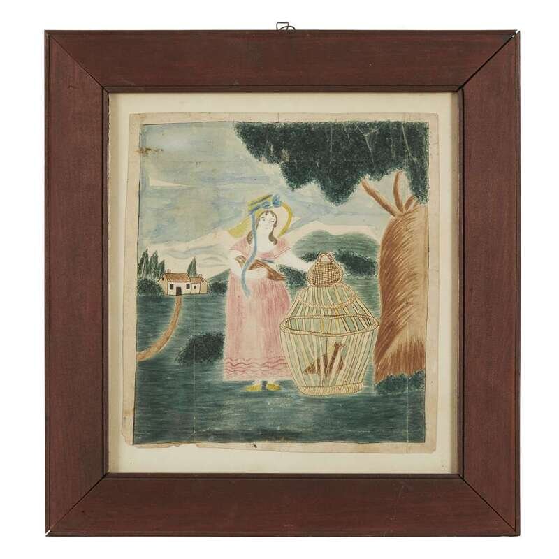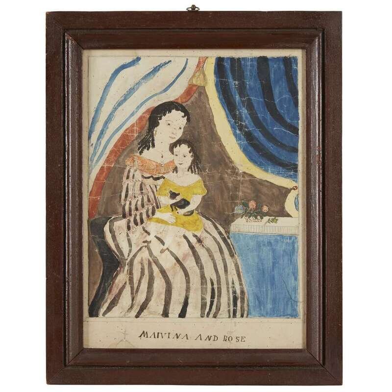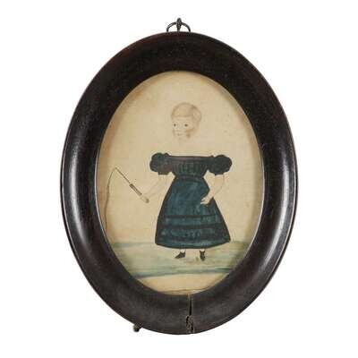 Comprising portrait of "Maivina and Rose" after the print The Two Sisters, by Nathaniel Currier, 1845, watercolor and ink on paper; portrait of a lady with caged fowl, probably after a print, inscribed "From Mary Hunt to Her Cousin Florence Berr(?)", dated 1832, watercolor and ink on paper; miniature portrait of gentleman, pen on paper, dated 1873 to reverse; miniature portrait of girl in blue with flower, watercolor on paper; and miniature portrait of child in blue with whip, watercolor on paper; all framed.