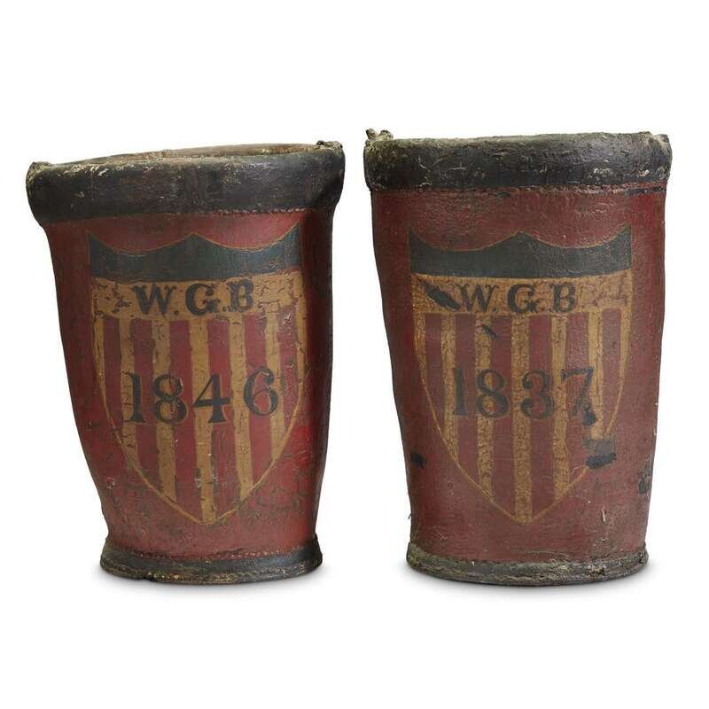 Pair of painted leather fire buckets dated 1837 and 1846