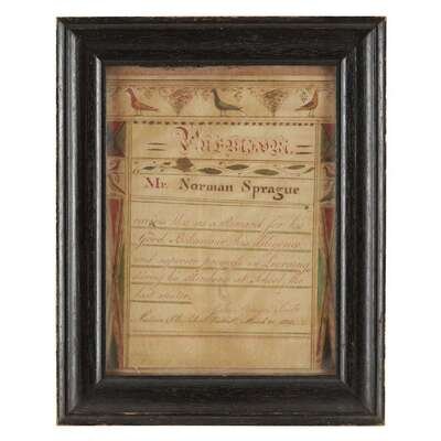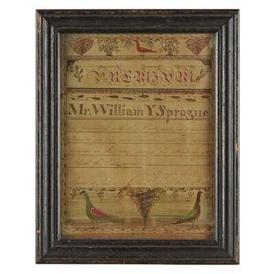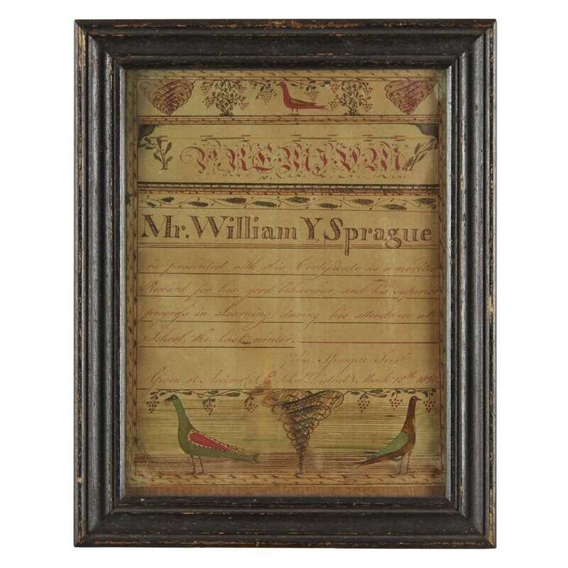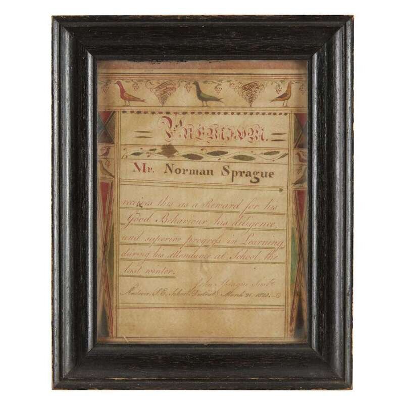 The first inscribed "Mr. William Y. Sprague is presented with this Certificate as a merited Reward for his good behaviour, and his superior progress in Learning during his attendance at School, the last winter/John Sprague Instr./Given at Andover (S. E. School District) March 18th, 1820", the second inscribed "Mr. Norman Sprague receives this as a Reward for his Good Behaviour, his diligence, and superior progress in Learning, during his attendance at School, the last winter/John Sprague Instr./Andover (S. E. School District) March 21, 1820"; watercolor and ink on paper, framed.