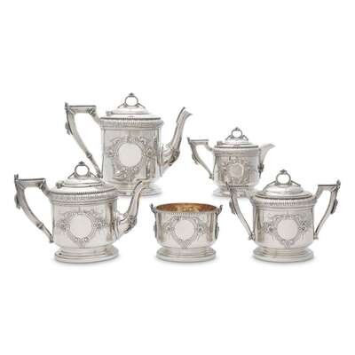 Five-piece .900 silver tea and coffee service Wood & Hughes, New York, NY, late 19th century