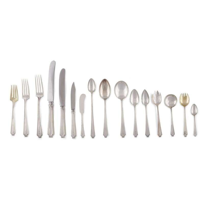 Comprising forty-two each: iced tea spoons; thirty-three each: small dinner forks; thirty-two each: small dinner knives; thirty each: salad forks (eighteen gilt-washed), dessert spoons, and large dinner knives; twenty-nine each: large dinner forks; twenty-four each: ice cream forks (eigheen gilt-washed); twenty each: demitasse spoons (four gilt-washed); eighteen each: butter spread knives, bread knives, cream soup spoons, and bouillon spoons; sixteen each: melon spoons; twelve each: tablespoons, soup spoons, and teaspoons; eleven each: serving spoons of various forms; five each: berry spoons (one gilt-washed); three each: nut spoons, small forks, and serving forks of various forms; two each: carving knives, tomato servers (large and small), and butter knives; one each: tongs, tea strainer, ladle, oyster fork, bottle opener, small perforated spoon, sugar tongs, cheese knife, small knife, cake knife, carving stake, and carving fork; bearing various monograms: "BR", "B", "P", and "D"; all marked. (approx. 437 pcs).