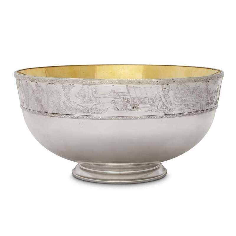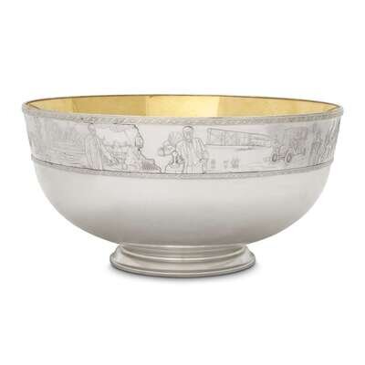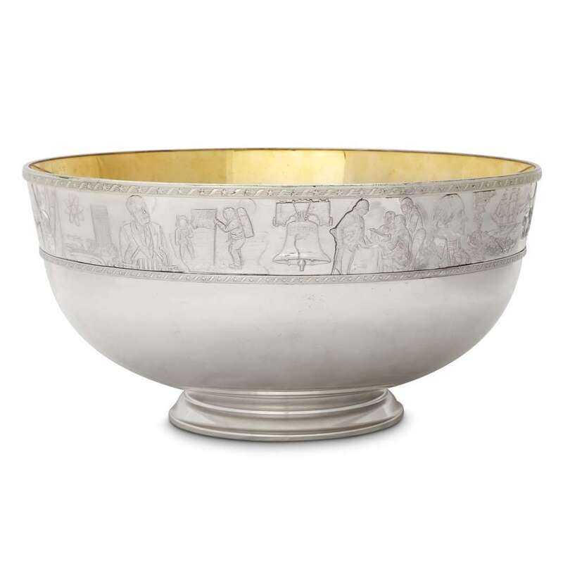 Inscribed to underside "The Franklin Mint Bicentennial Bowl/Number 469 of 750/Solid Sterling Silver/Lined With 24kt Gold/Copyright 1976", banded rim decorated with scenes depicting American historical figures and moments in politics, war, science, culture, industry, and commerce.