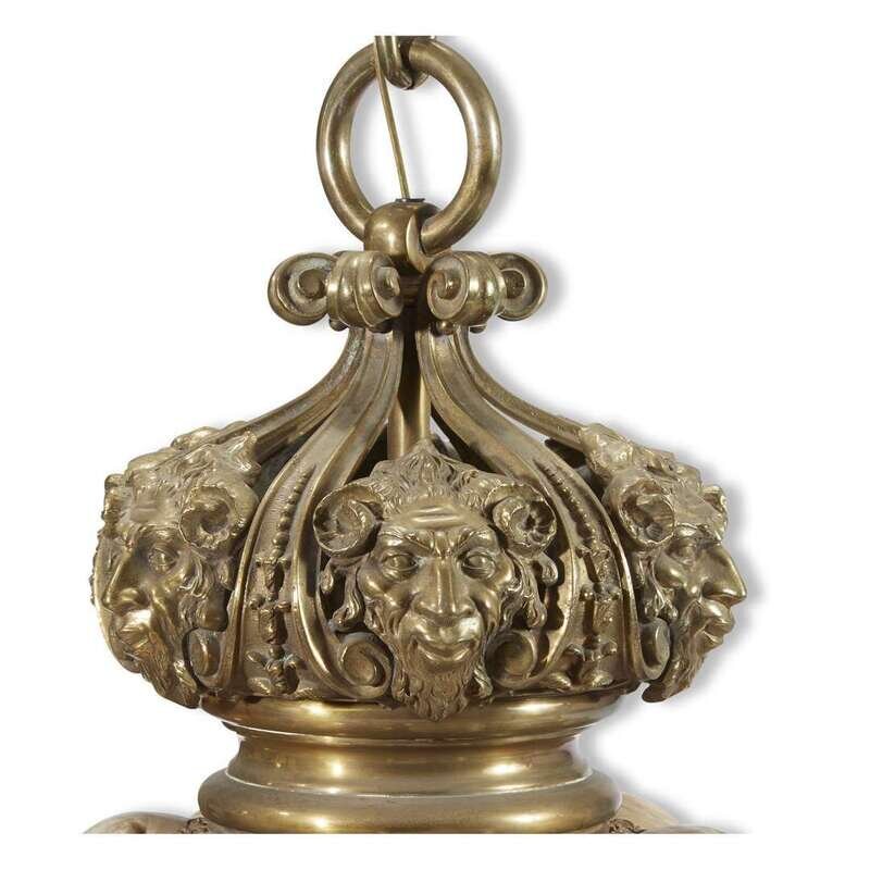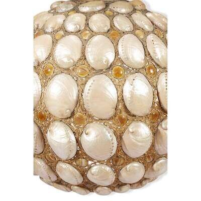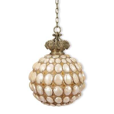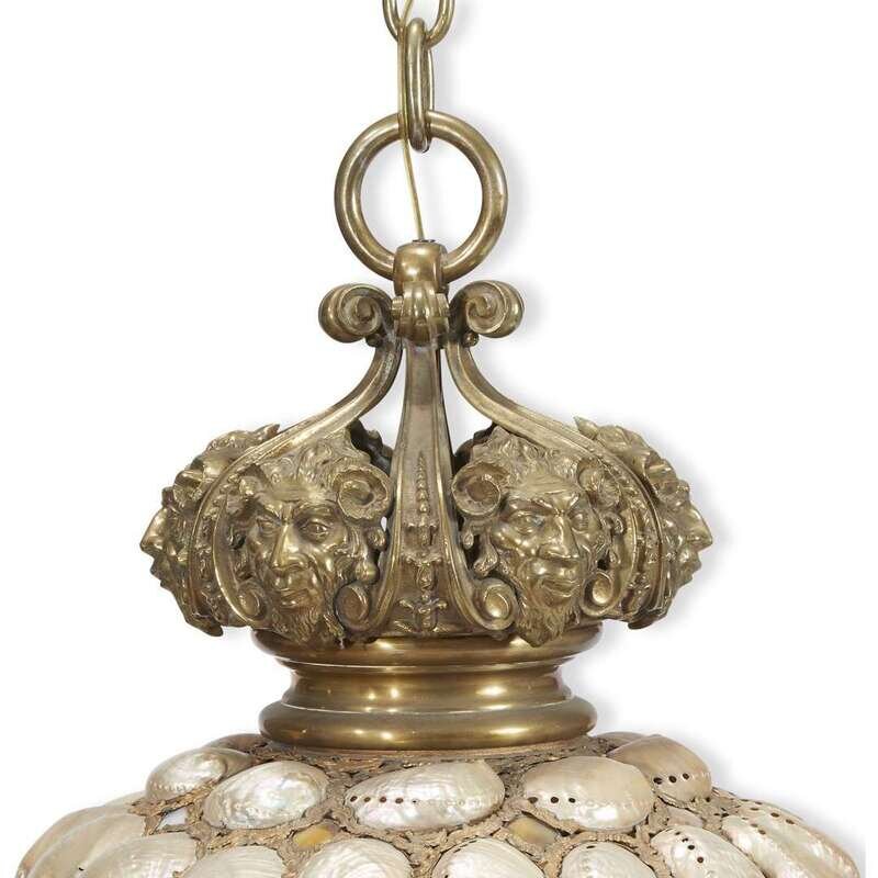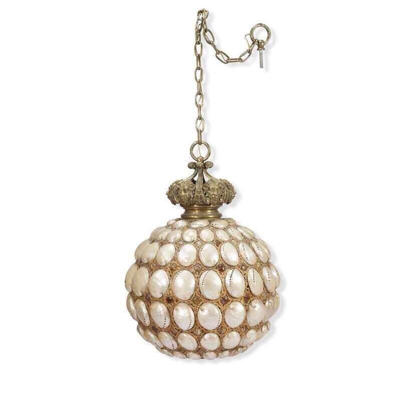 The gilt metal spherical form is set with shells and stained glass "pebbles", suspended from cast brass cap.