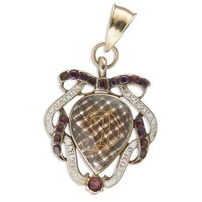 Hair work, gold, garnet, enamel, and garnet love token pendant French, early 18th century