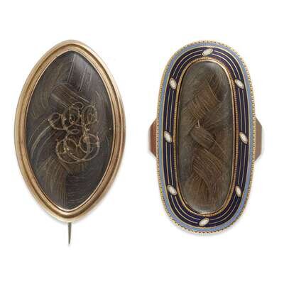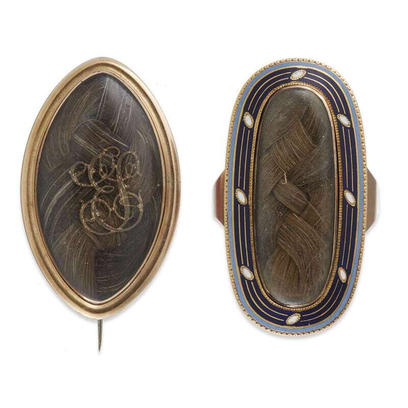 Georgian gold and hair work mourning pin and Georgian gold, enamel, and hair work mourning ring early 19th century