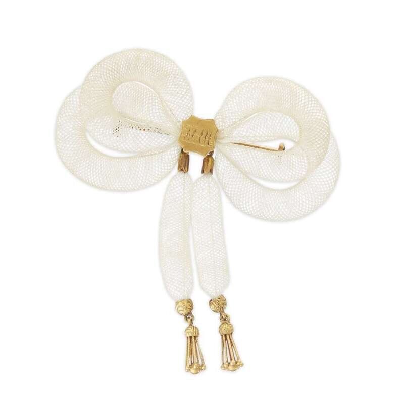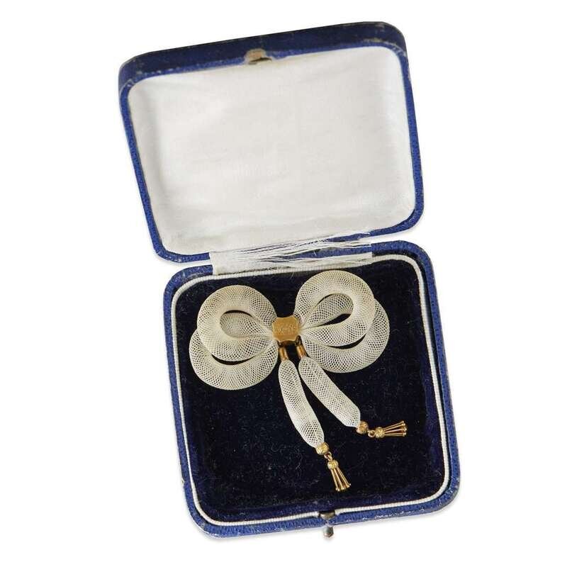 An example of delicate table work, with gold slide fastener engraved "FJAM"; accompanied by display box.