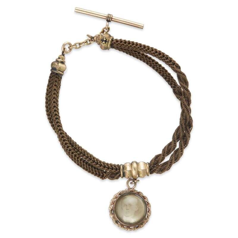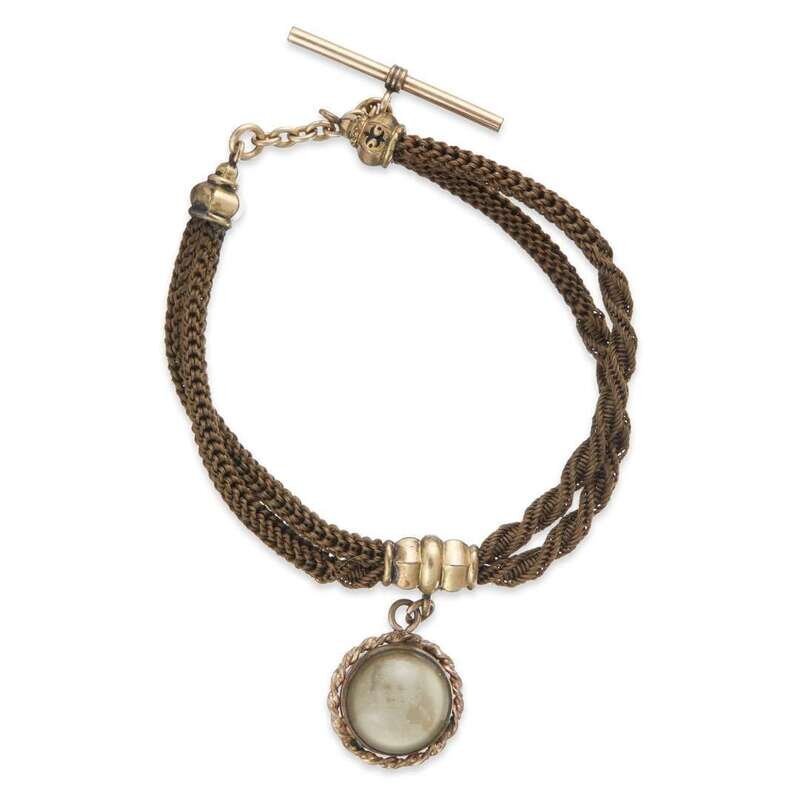 Woven hair work, gold, gold plate, and glass watch fob 19th century