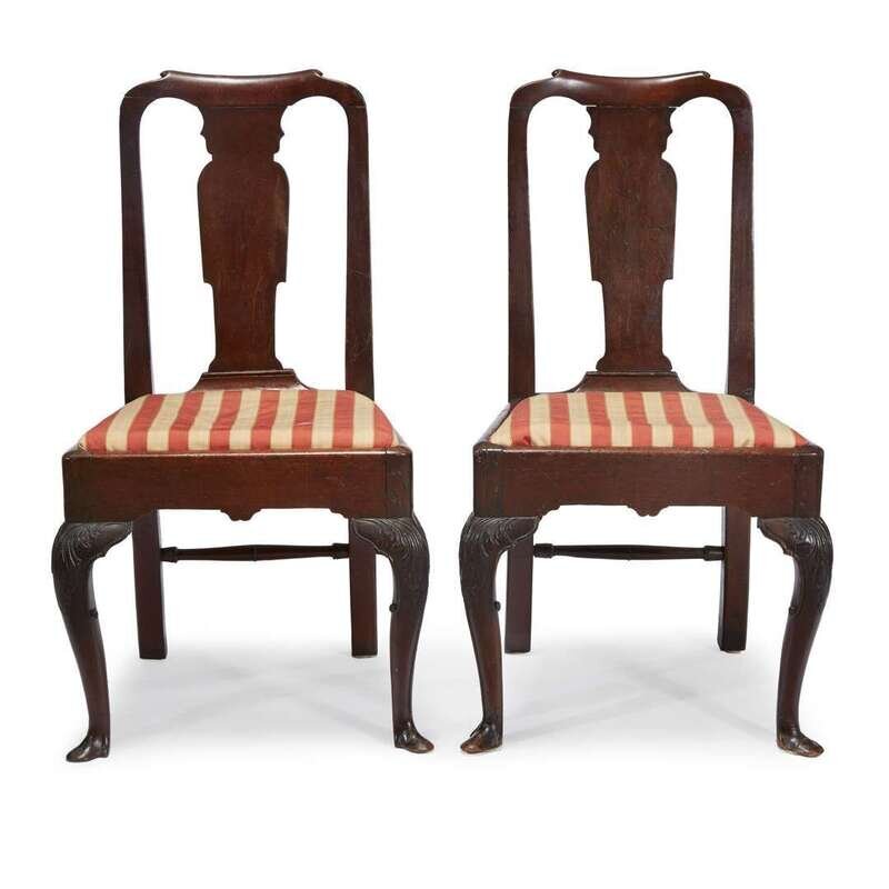 With shaped crests on solid urn-form splat, slip seats on cabriole legs with carved knees, trifid "shoe" form feet.
