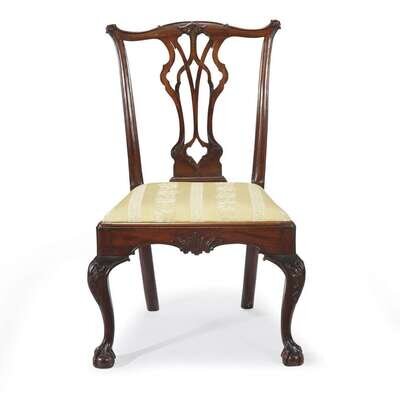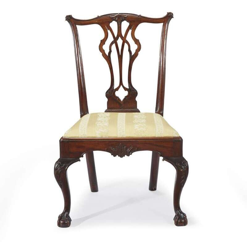 circa 1775 Serpentine crestrail carved with floral ears and leafage, pierced Gothic splat, trapezoidal slip seat, straight seat rail with center leaf carving, leaf carved cabriole legs, ball-and-claw feet.