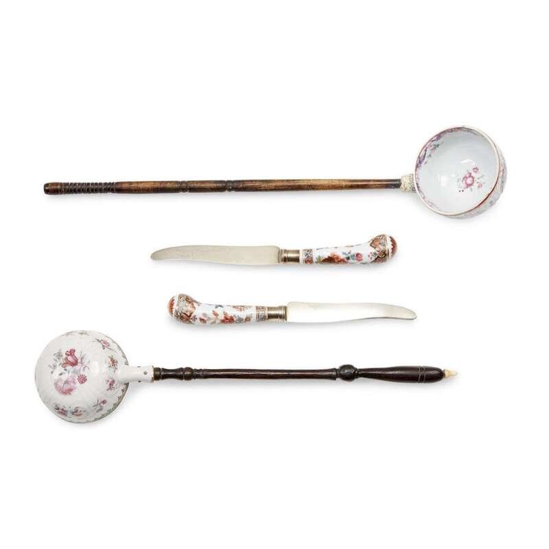 Two ladles with Chinese Export porcelain famille rose bowls 18th century