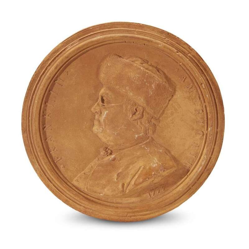 Rare terracotta medallion of Benjamin Franklin with spectacles Jean-Baptiste Nini (1717-1786), France, 1777