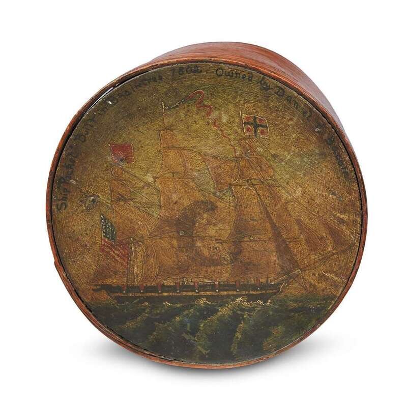The top depicting the packet ship owned by Daniel Carpenter Bacon (1787-1856) of Barnstable and Boston, Massachusetts; inscribed "Ship 'Packet' Built in Braintree 1802. Owned by Daniel C. Bacon", the interior lined with newsprint from "The Boston Courier," May 7, 1837.
