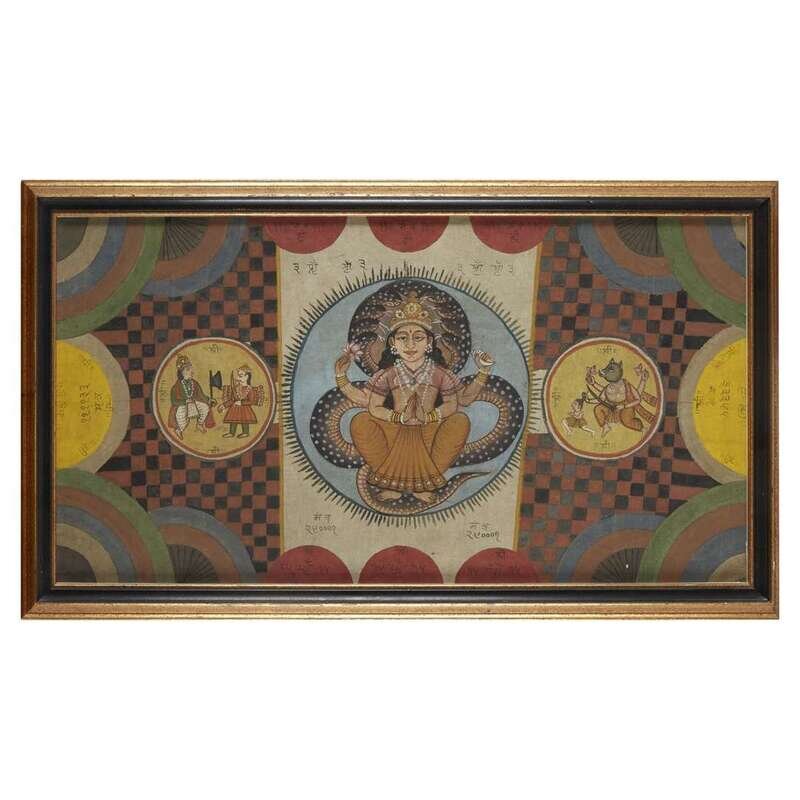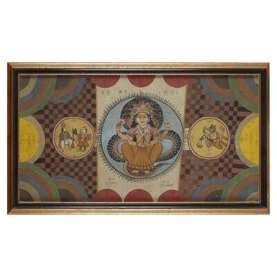 Devotional image of a Devi on a serpent Color on fabric, inscribed at edges. Framed, matted, and glazed.
