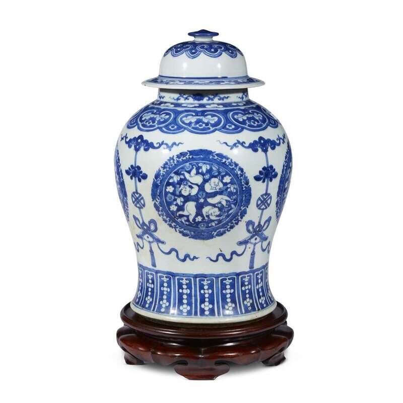 A Chinese blue and white porcelain "Boys Roundals" jar and cover Qing dynasty