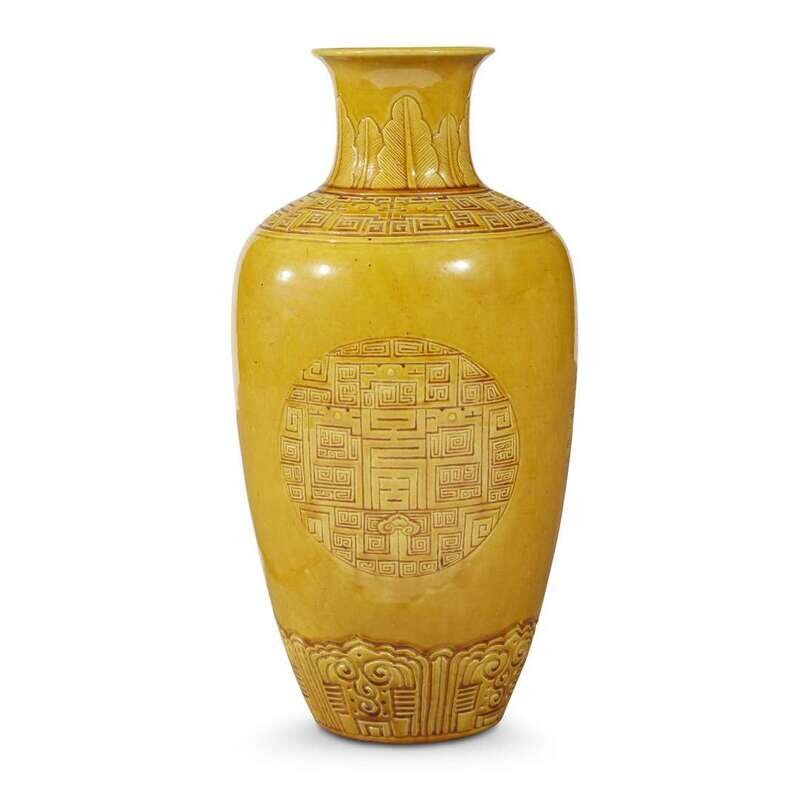 A Chinese incised yellow-glazed porcelain vase molded six-character Qianlong seal mark