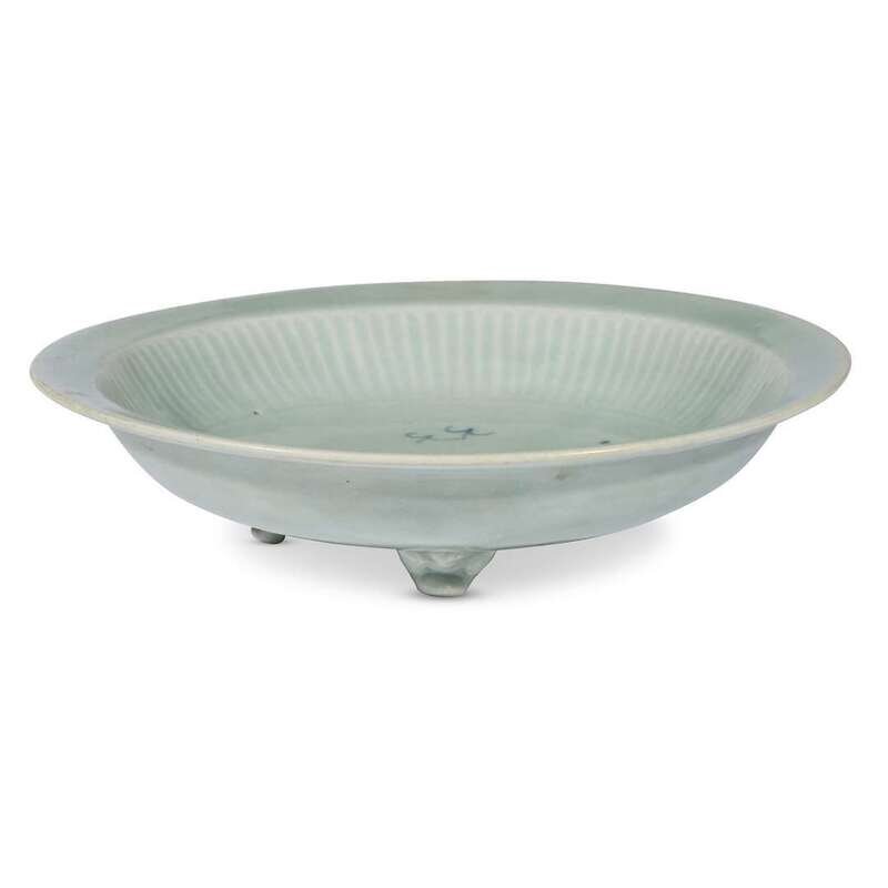 The interior decorated with stylized water and plants, the cavetto molded with a ribbed texture, raised on three legs.
