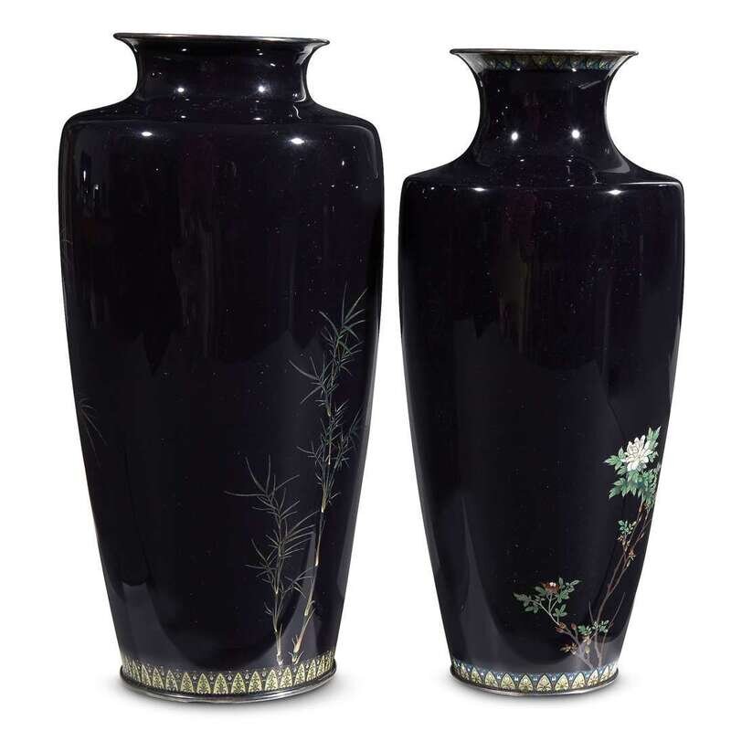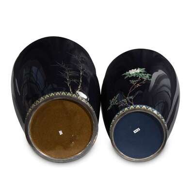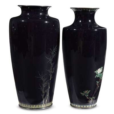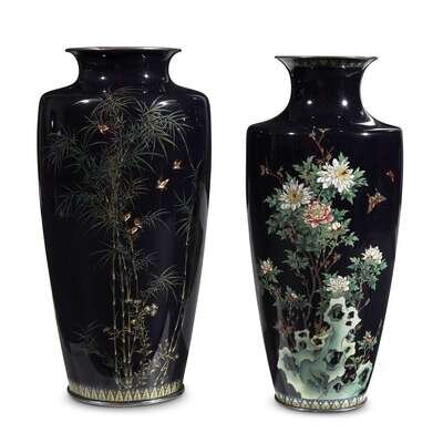 Two finely-decorated Japanese cloisonné vases: "Peonies and Insects", "Sparrows and Bamboo" Meiji period, late 19th/early 20th century
