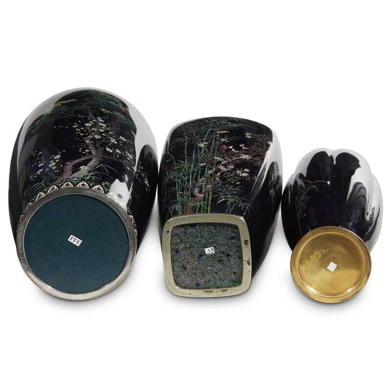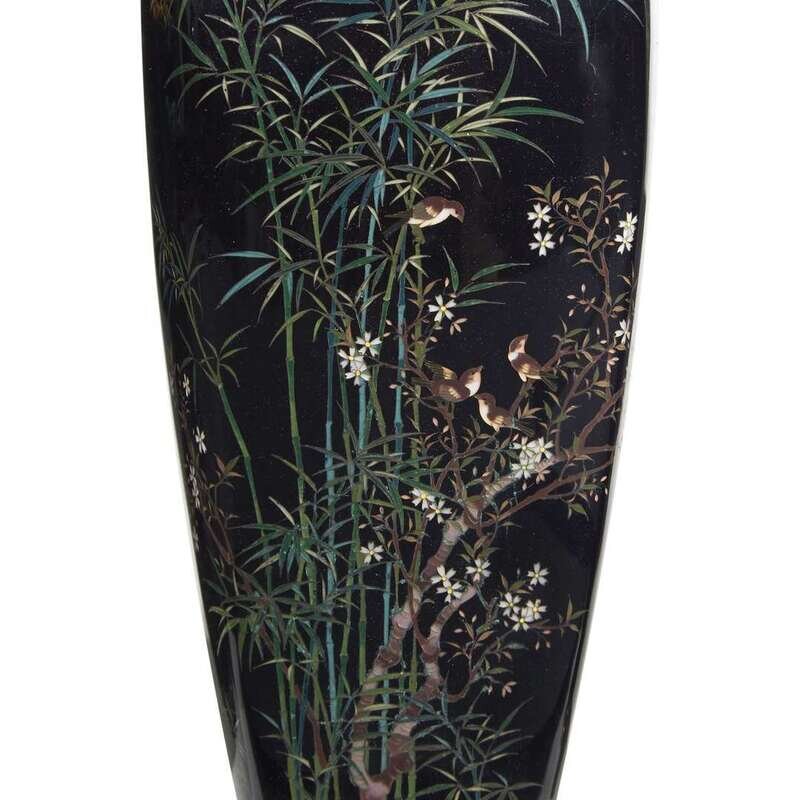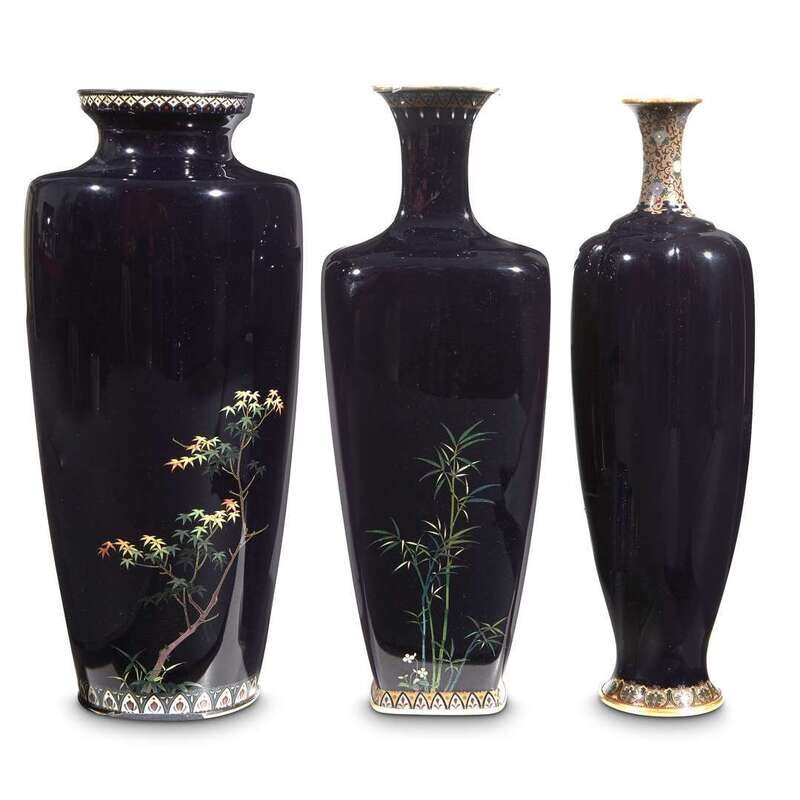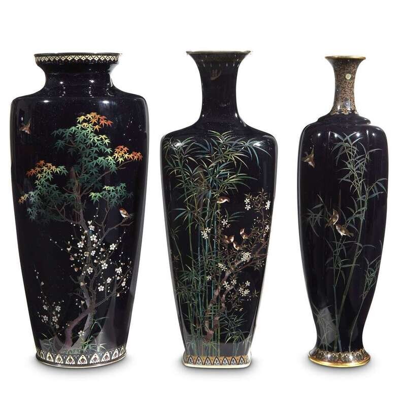 All of dark midnight blue ground; The first of vasiform, decorated with birds among prunus and autumnal maples in silver wire, one sparrow in gold wire; the second of squared vasiform, decorated with birds among flowering prunus and bamboo, silver wire, the sparrows with gold wires; the third of attenuated lobed baluster form, decorated with sparrows in golsd wire among bamboo in silver wire.
