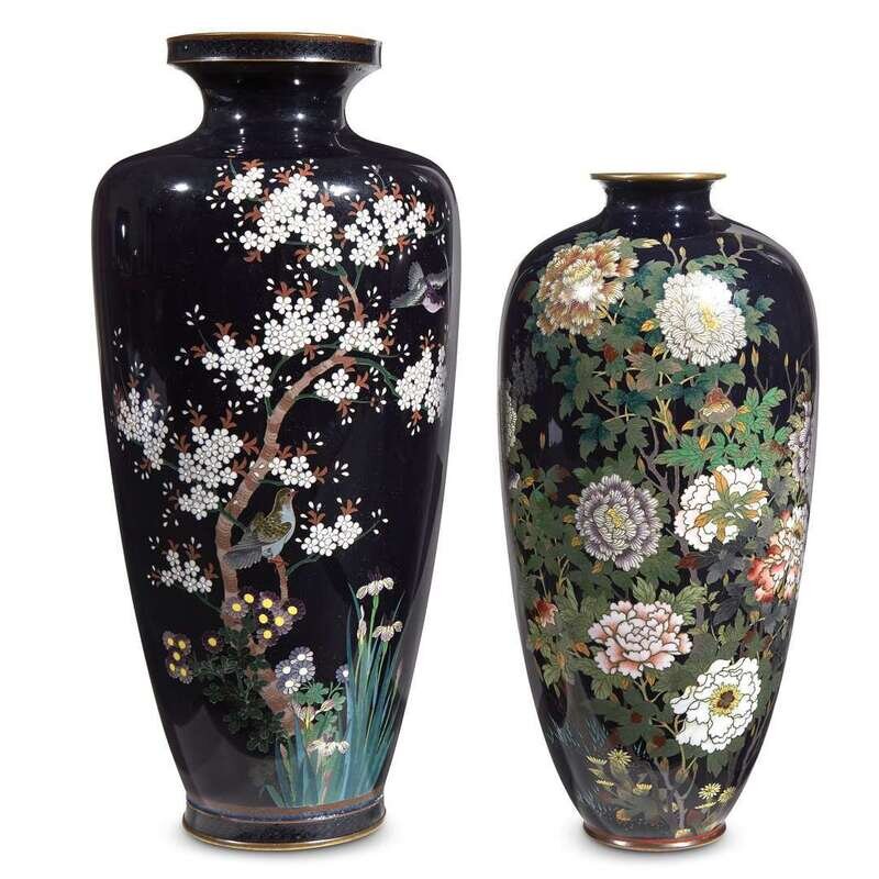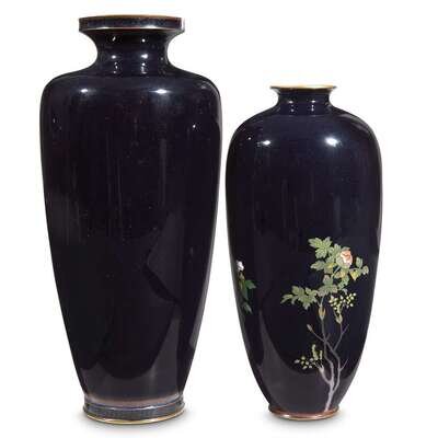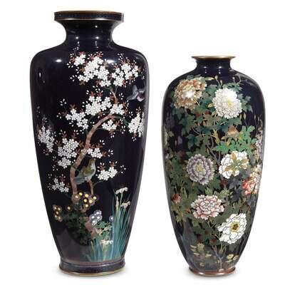 Two Japanese cloisonné vases: "Peonies"; "Pigeons and Prunus" Meiji period, late 19th/early 20th century