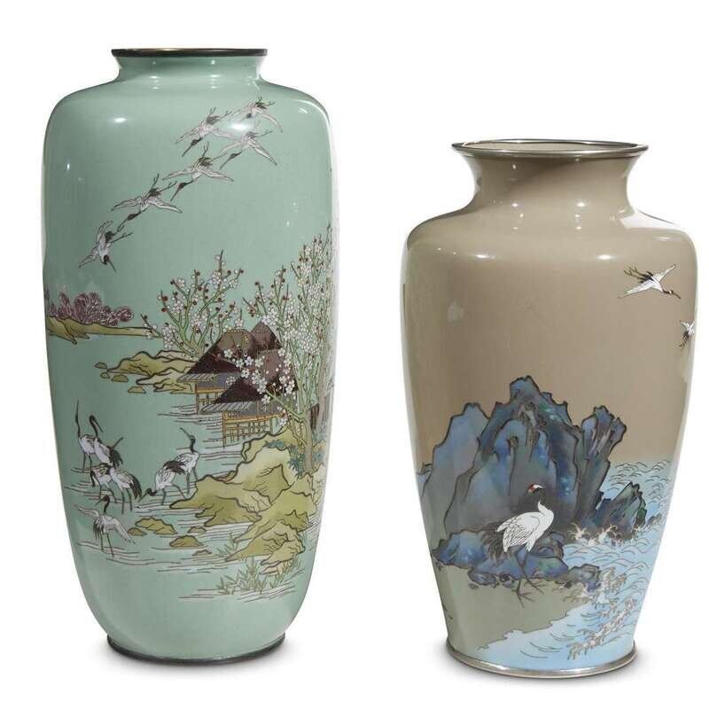 Comprising two ovoid vases, the first with a flock of cranes by a river-front village with flowering prunus, tooled silver wires, celadon ground, underside with stamped maker's mark; the second with cranes by a rocky seacoast, delicately colored, beige ground.
