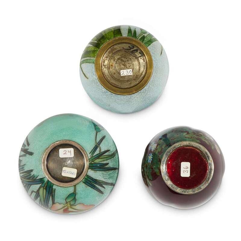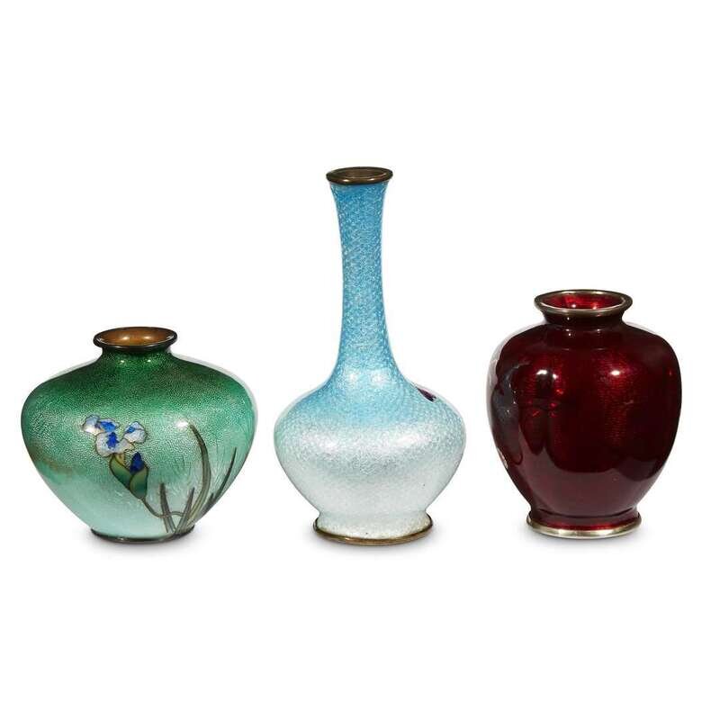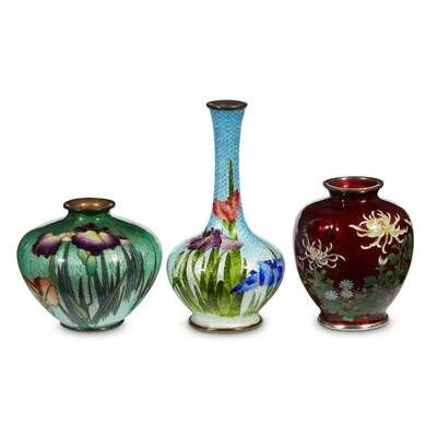 The first, Kumeno Teitaro, with colored irises on a graded light green background, stamped maker's mark to the underside; the second a lobed cloisonne and ginbari vase with chrysanthemumon and asters on pigeon blood red ground, underside stamped "JAPAN"; the third a long-neck vase, Kumeno Teitaro, decorated with colored iris on pale blue shaded ground, underside with stamped maker's mark.