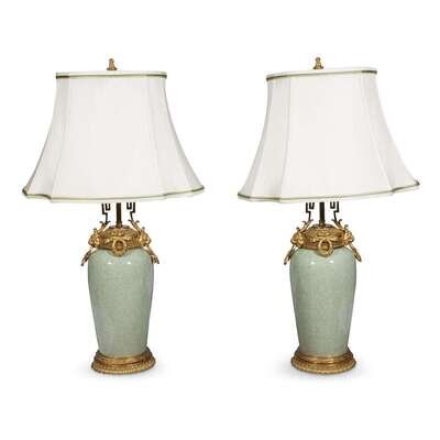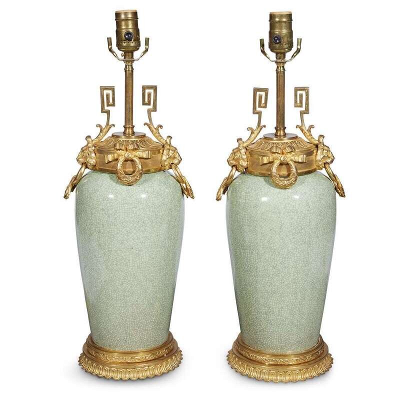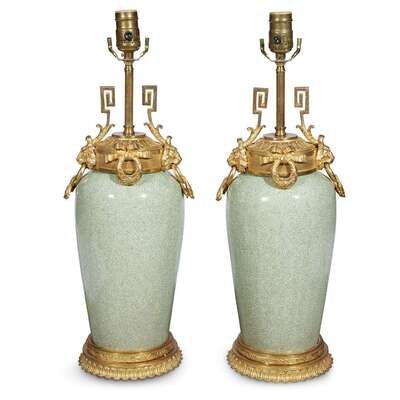 A pair of Louis XVI style gilt-metal mounted craquelure glaze celadon vases 20th century