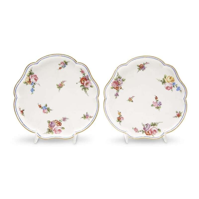 With blue underglaze interlaced L marks and date code "V" for 1774, with additional painter's marks for Nicolas Rouelle, Jean-Baptiste-Emmanuel Vandé père, and and François Binet. (2).
