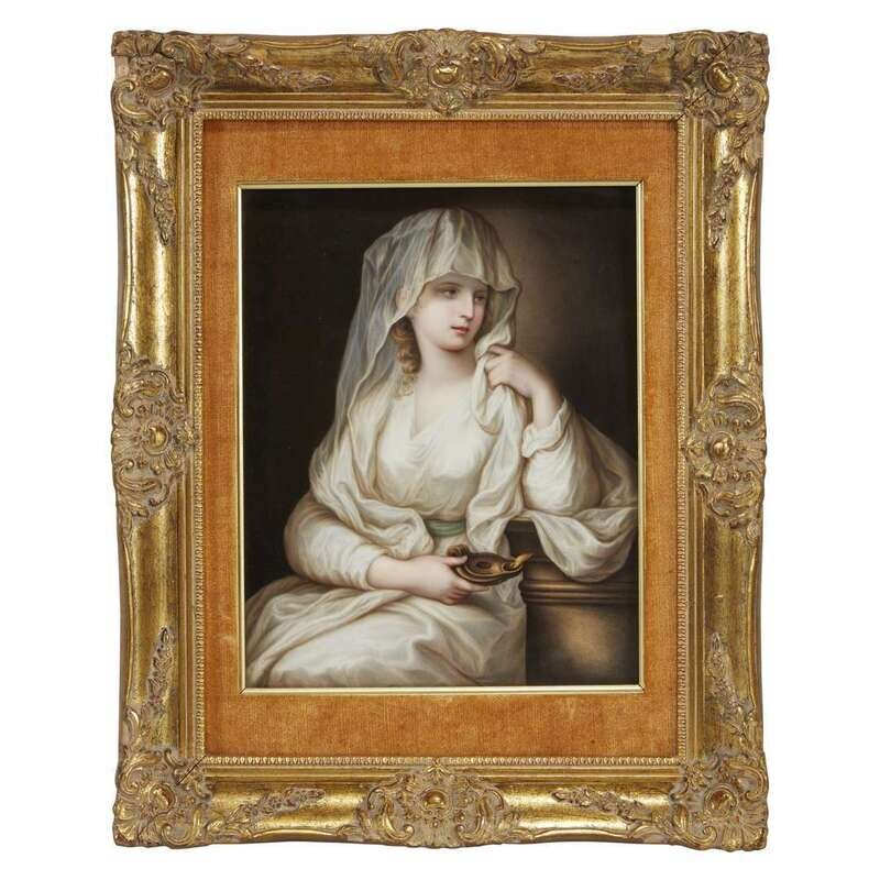 Very finely painted, depicting a classical maiden holding a terracotta lamp, the verso incised with plaque size and with impressed scepter mark; housed in giltwood and velour frame.