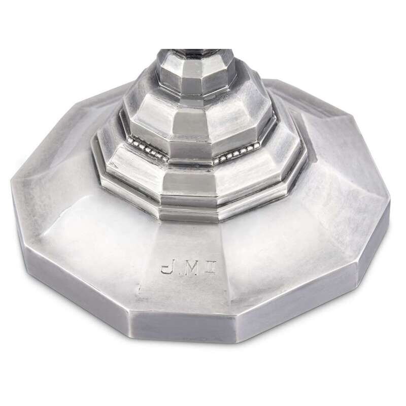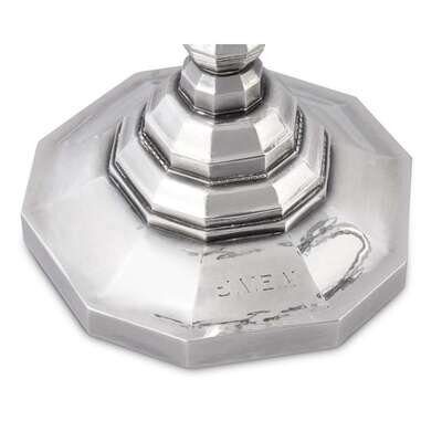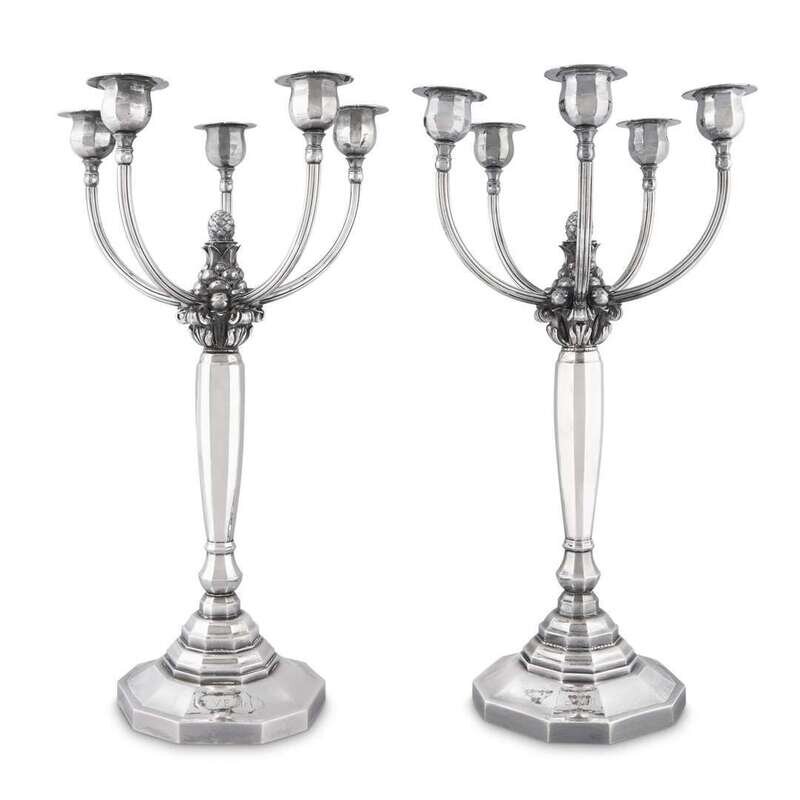 Model No. 474 designed by Johan Rohde in 1927, the faceted tapering central column with a bunch of fruit and pineapple cresting, five scroll branches with sconces, the column to a base of stepped decagonal form, engraved initials. (2).