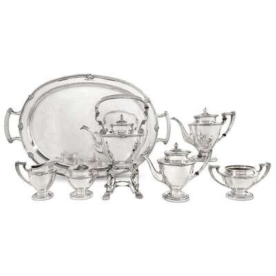 Comprising a kettle on stand, teapot, coffee pot, covered sugar, creamer and waste bowl, each marked to bottom. (7).