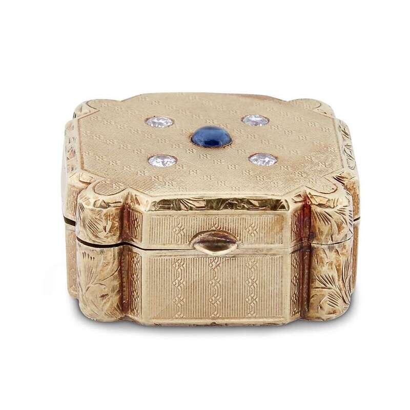 A French gold, diamond and sapphire set 14-karat engine-turned gold pill box unknown maker's mark, marked 14K, 20th century