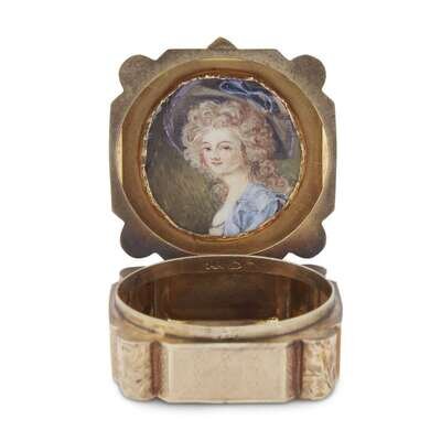The shaped square hinged cover set with central sapphire cabochon and four old cut diamonds; the interior of lid with inset portrait miniature in an 18th century style and with acorn-form maker's mark; the exterior engine turned and with blank cartouche to underside.