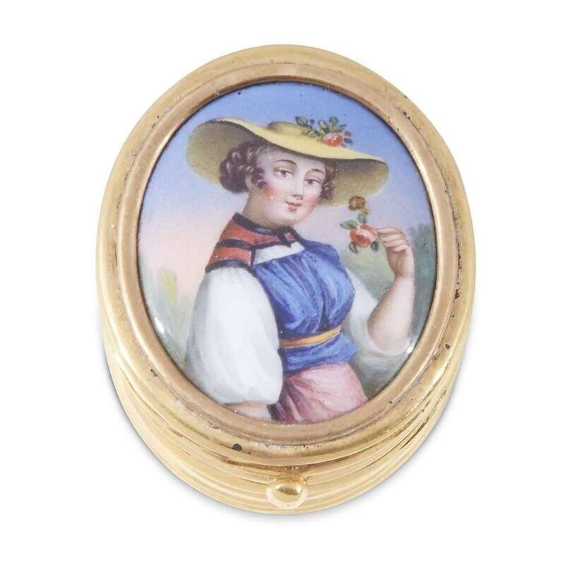Of oval form, the hinged cover with inset enamel on copper portrait of a young girl holding a flower; with reeded sides and plain interior and base.