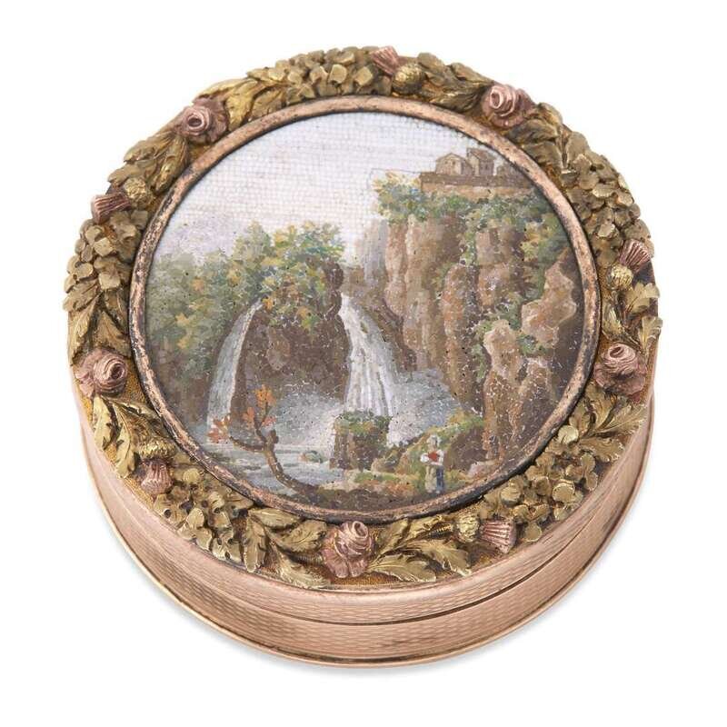 The pull off cover set with micromosaic panel of classical buildings above a waterfall, the well-cast border of thistles and roses.